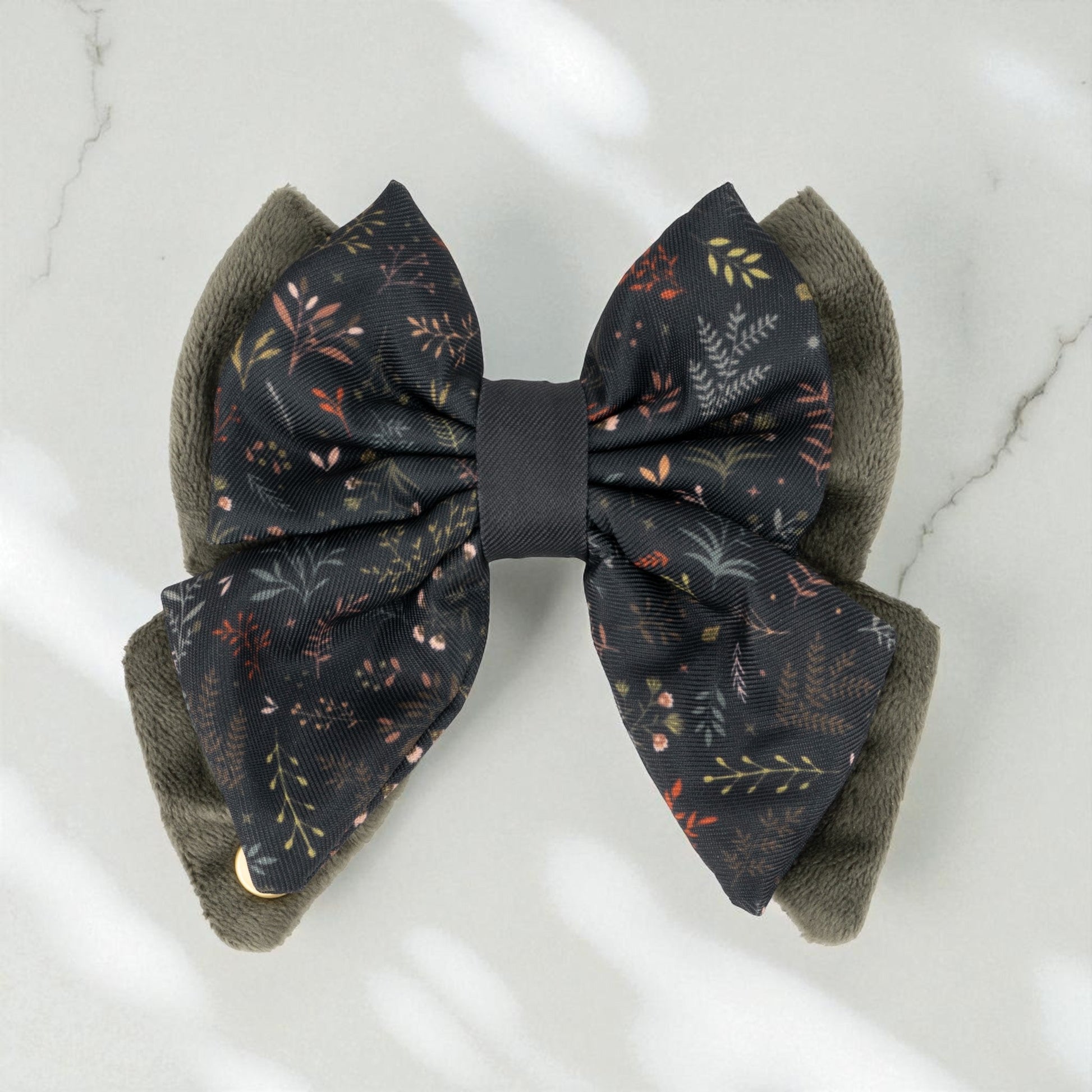 Crafted from two sailor bows layered to create a stunning butterfly shape, this bow combines ultra-soft plush velvet with matching printed fabric for a refined look. Finished with a golden branded stud for that extra touch of elegance.