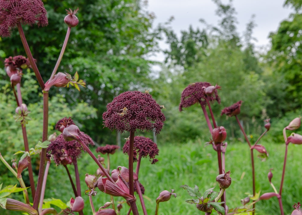 - Flowers: Angelica gigas produces large, domed umbels of deep burgundy to purple flowers on sturdy, hollow stems. These blooms appear from mid to late summer (July to September) and are a magnet for pollinators.