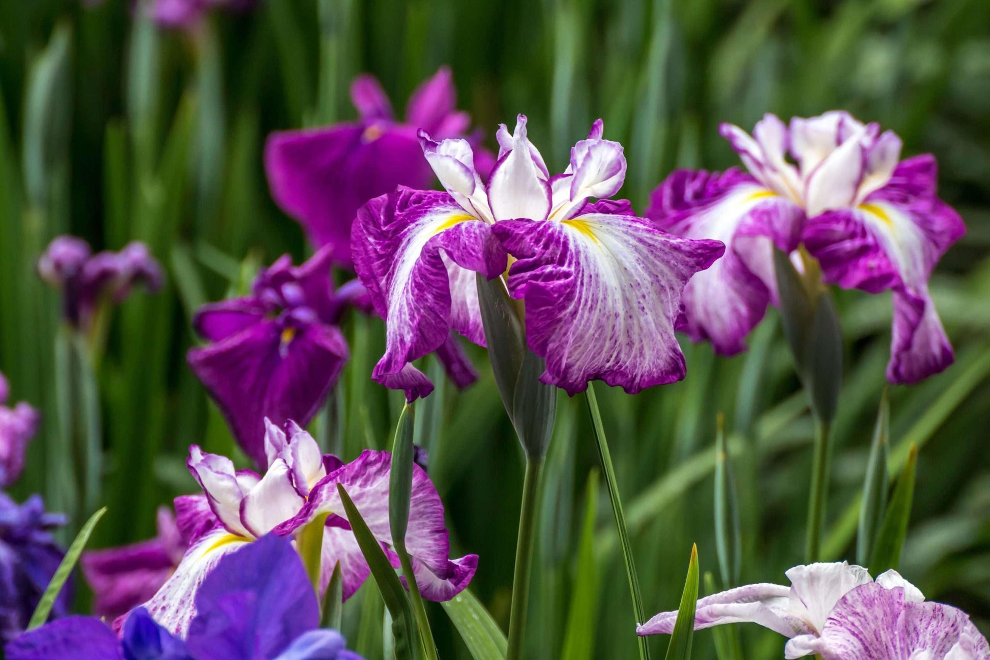 - Iris ensata 'Harlequinesque' produces large, showy flowers with a bold combination of deep purple and white, accentuated by striking veining.