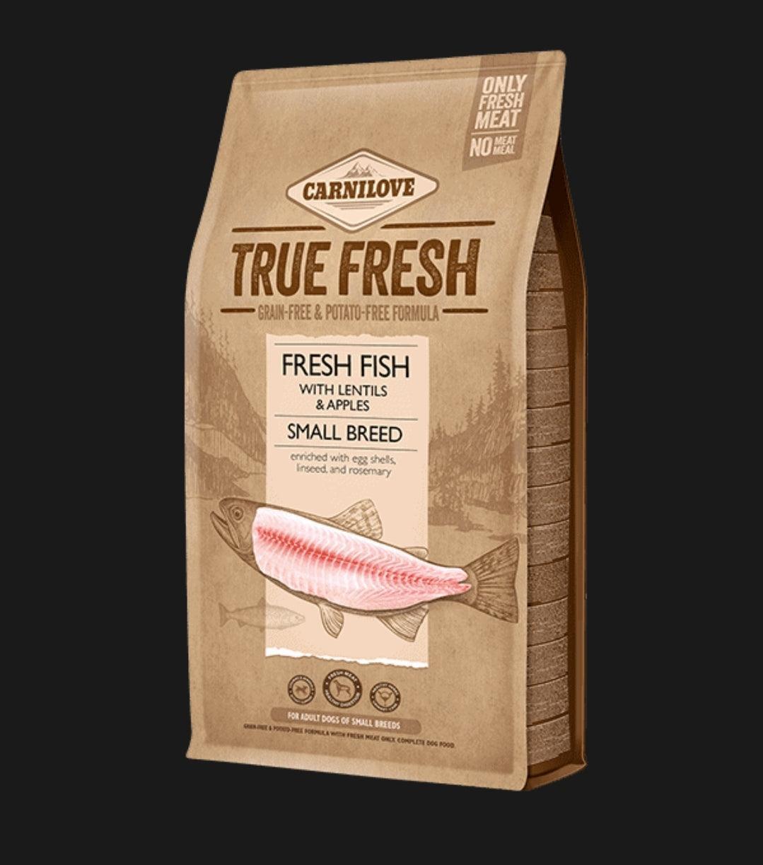 Carnilove True Fresh Fish with lentils & apples is a complete formula with fresh meat for small breed dogs. Enriched with egg shells, linseed and rosemary.