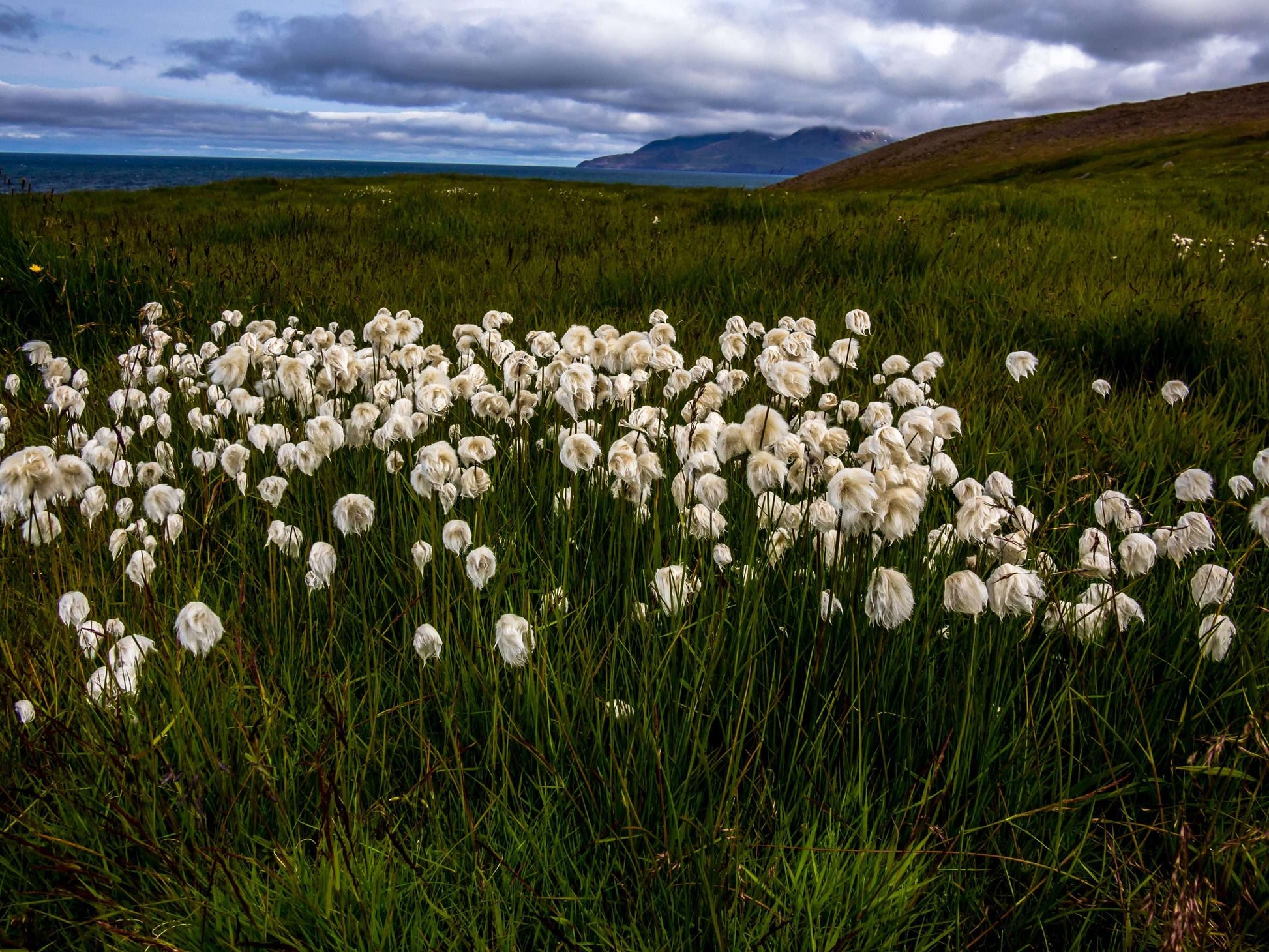 - Eriophorum scheuchzeri produces fluffy, white, cotton-like flower heads that rise above its narrow green leaves.