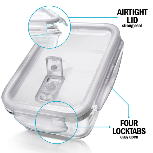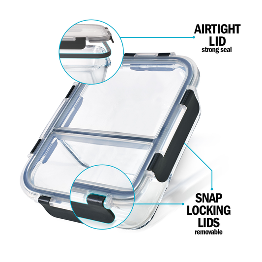 2-Compartment Glass Container with Airtight Lids - 980ml - 3 PACK