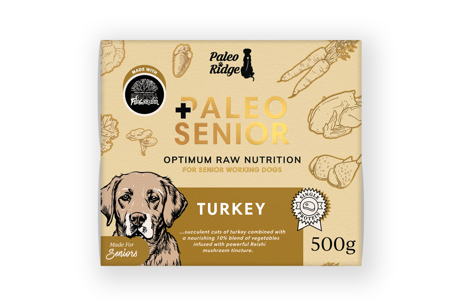 Paleo Senior Turkey is an exclusive, premium raw dog food designed to meet the distinctive needs of senior dogs and enhanced with Reishi mushroom tincture. *Low in Fat *Single Protein *Great for Sensitive tummies *Grain free *Hypoallergenic *Suitable for seniors *Recyclable packaging *Healthy skin & coat *Oral hygiene *Reduced allergies *A strong healthy immune system
